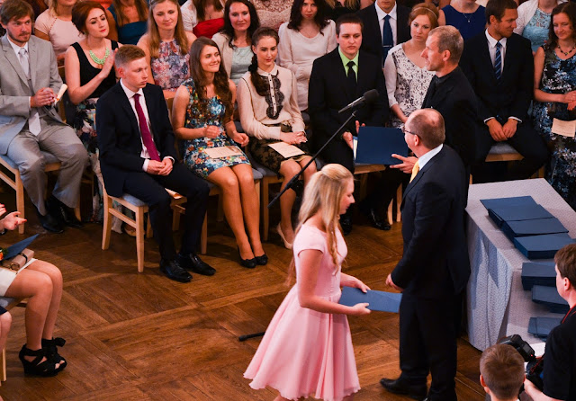 Lõpuks saan siis mahti natuke oma lõpukleidist kirjutada ja ka lõpetamise kohta paar sõna öelda. Eelmise postituse põhjal oli vist aru saada, et ma olen üks suur lõpetamistefänn ja kui nüüd päris aus olla, siis nii kaua on siinse postitusega aega läinud just seetõttu, et mitte päris kõik ei läinud sel lõpetamisel just nii, nagu oodanuksin. Ei-ei, ma ei komistanud diplomi järele minnes, ei pillanud pastakat allkirja andes käest maha ega muud sellist ja iseenesest oli ikka täitsa kena lõpetamine, õnnitlema oli tulnud inimesi, kellelt ma seda absoluutselt oodanudki poleks ja kõik oli selles mõttes veel toredam kui tore, aga pettuma pidin just selles oma lemmikosas - enese ilusaks tegemine ja sätitult ja kenasti saalis kõigi pilkude all istumine ja tagatipuks ilusad pildid. Kõik sai alguse sellest, et peahoone poole teele asudes kallas vihma otsekui oavarrest, mis tähendas, et kleidile tuli peale tõmmata mantel ja vihmavari. Kuna olin pisut hilinemas - lõpetajad pidid aula ukse taha kogunema kell 14.50, et siis täistunnil kenasti muusika saatel saali siseneda - astusin kiirel sammul ja kuna vaatamata vihmale oli ilm suhteliselt lämbe, jõudsin selle kooliminekuga juba naha kenasti märjaks saada. Teiseks on mu juuksed vist pirtsakaimad maailmas, mis tähendas, et niiskuse ja tuule koosmõjul olid peahoone juurde jõdmise hetkeks mu lokkidest alles vaid kerged lained ja hetkeks, mil aulas maha istusin, polnud neidki, olid vaid lihtsalt sorakil salgud. See viimane transformatsioon oli paraja korraldusliku bläki tulemuseks, sest jõudnud peahoone juurde (kellaaeg näitas siis mugavalt täpselt 14.48), avastasin, et uksest ei saa sisse. Eelmise aktuse inimesed olid ilmselt suuremas jaos hoonesse sisse jäänud, sest vihma ju kallas ja nii ootasid meie aktusele tulijad kõik tropis ukse taga, vihmavarjud pea kohal nii, et aeg ajalt nirises kellegi varju nurgast midagi ikka kellelegi teisele krae vahele ja nii me siis seal seisime. Seisid nii lõpetajad kui külalised ja kuigi vahepeal üritas nii mõnigi agaram lõpetaja endale teed teha hüüdes, et lõpetab ning, et ta läbi lastaks, siis miskisugust abi sellest polnud ja sisse keegi kiiremini sellegipoolest ei saanud. Ühel hetkel sai vihm läbi ja kui siis inimesed püüdlikult, et tekitada võimalikult väikeseid veekahjustusi (mida oli hulgim juba nagunii), oma vihmavarjud kinni panid, hakkasid vaikselt eelmised aktuselised hoonest välja tulema, sisse ei pääsenud endiselt pea keegi (st mina ei liikunud järjekorras edasi millimeetritki veel tükk aega). Hakkasin siis valmistuma aktuseks, et sisse saades enam jokutama ei peaks - pakkisin kokku vihmavarju ja sooritasin üle ülikooliesist paksult täitva rahvamassi meisterviske lootusega, et väikevend Raid mu varju kinni püüab (püüdis ka, kuigi ma arvan, et seda viset võis nii mõnelgi, kelle peadest mu vihmavari üle lendas, olla üpris hirmutav vaadata), rahvamassis koorisin seljast ka mantli ning üle inimeste peade õnnestus see mul pisut eemal sissesaamist ootavale isale ulatada. Sisuliselt olin valmis, aga sisse ikka ei saanud, soeng oli hukas ja ega meikki pärast läbi vihma kohale tormamist ja rahvamasis higistamast enam eriti värske tundunud. Mõtlesin omaette küll, et ei tea, äkki hakkab asi pihta (sest kell näitas juba omajagu üle kolme), aga kuna ümberringi oli näha päris mitmeid lõpetajaid peale minu, ei uskunud ma, et asi niiviisi alata saaks. Lõpuks kui ummik vaikselt liikuma hakkas ja ma veel enne trepist üles minekut vanaemalt saadud salvrätiga kingad ja säärte tagaküljed poripritsmetest puhtaks sain tehtud, hakkasime paari teise lähedal oleva lõpetajaga arutama, et ei tea, kuhu koridori me siis täpselt kogunema pidime, et kuskil pole kedagi väga nagu näha, kui äkki keegi meist saaliuksest sisse piilus ja seal juba mängis sissetulekumuusika ning enamik lõpetajaid juba istus oma kohtadel, keegi siis tõukas meid ka seljatagant, et sisse läheksime ja kui olin vahetanud paar kiiret sõna mulle vastu tulnud õppekorraldusspetsialistiga (ta tahtis teada, kas õue jäi veel lõpetajaid, kinnitasin, et minu meelest oli neid minust tagapool küll), avastasin, et meie, kes me koos nüüd sisse olime tulnud, saime istuda põhimõtteliselt viimasesse ritta vasakule äärde ja meie ees mitmes reas istusid mingid tädikesed oma lilletuutudega, kes olid aktust lihtsalt vaatama tulnud (kuigi algul oli öeldud, et pealtvaatajaid lubatakse vaid rõdule ja et saalis on ainult lõpetajad), lisaks liikusime me oma kohtadele ka otse uksest mööda seina äärt, kui teised (nagu hiljem videolt nägin), olid ilusti saali eest läbi käinud. Pärast meid tilkus sinna saali muidugi veel lõpetajaid, sisuliselt ajal, mil aktus oli juba pihta hakanud. Ma ei saa lihtsalt aru, kuidas saab hakata aktusega pihta, kui suur osa inimestest, kelle auks seda aktust üldse peetakse seisavad sel ajal alles välisukse taga järjekorras, sest nad lihtsalt ei mahu majja sisse? Oleksin ma seda teadnud, oleksin endale ehk küünarnukkidega teed teinud?! Oleksin ma siis olnud ainuke "hilineja" (jutumärkides seetõttu, et tegelikult me ju keegi ei hilinenud ja minu jaoks on müstika see, mis hetkel need teised lõpetajad hoonesse sisse pääsesid), mispuhul oleks see "küünarnukkidega tee tegemine" ka aktsepteeritav olnud, aga meid oli seal vähemalt 10-20 lõpetajat ja kui kõik viisakalt ootavad, oleks viisakas ka nemad ära oodata enne kui asi pihta hakkab! Nojah, see selleks, sain diplomi kätte, dekaani käepigistuse ja kuulsin hulga innustavaid sõnu ja oligi aeg õnnitlusi vastu võtma minna. See oli imetore, poleks uskunud kui palju häid sõpru ja tuttavaid mul on ja tõeliselt hea tunne oli saada nii palju kallistusi ja häid soove. Tõrvatilgaks meepotis oli aga algav pildistamisesaaga, nimelt tahtis mõni pereliige juba kohe seal samas, rahvamassis, kus ei ole ruumi pea hingatagi, hakata tegema pilte sajas erinevas kompositsioonis ja saja 